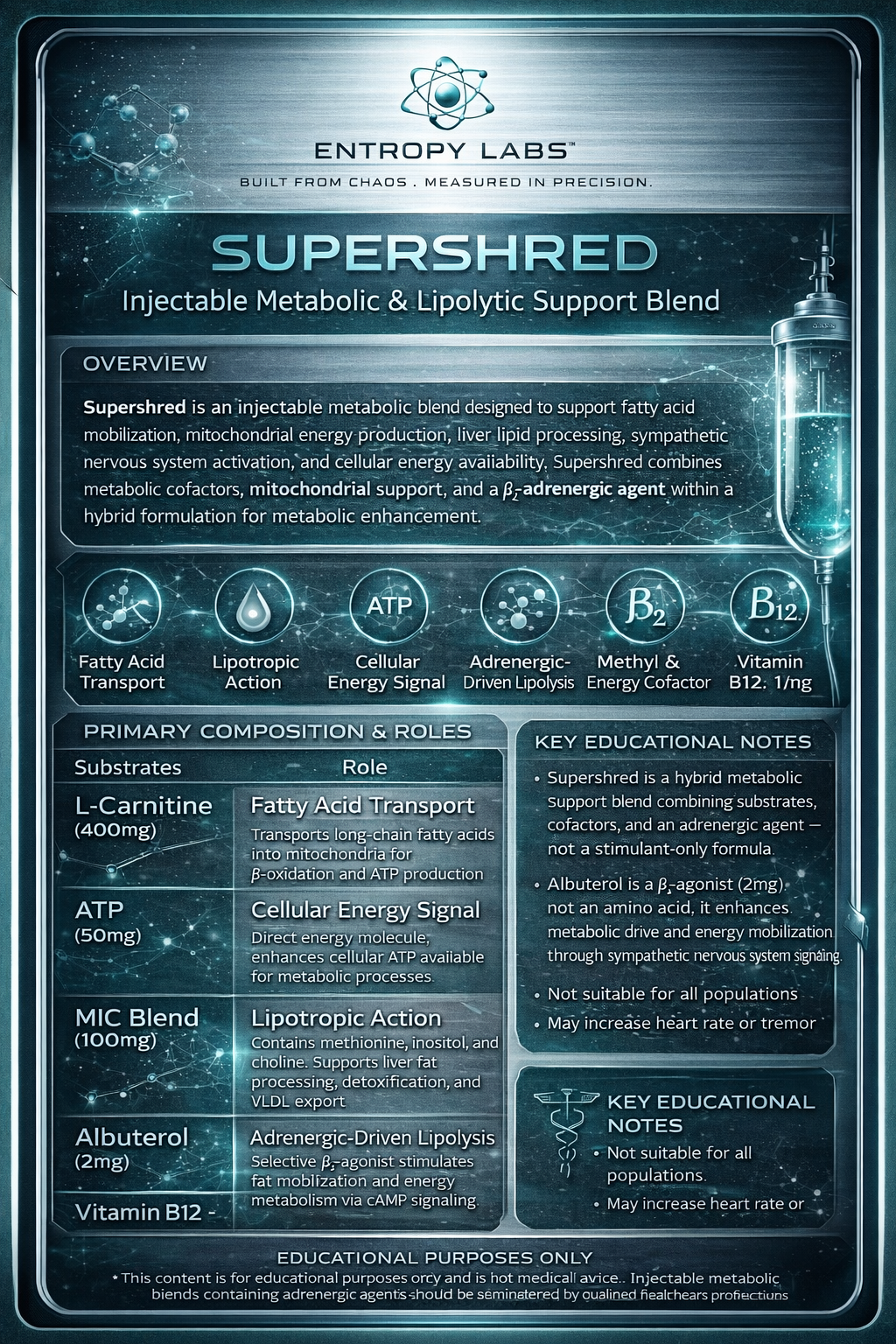 Supershred is a hybrid injectable metabolic support formulation designed to target multiple pathways involved in fat utilization, cellular energy production, and metabolic output. Unlike basic amino or vitamin blends, Supershred integrates metabolic substrates, lipotropic compounds, and adrenergic signaling components to support a more comprehensive metabolic response.