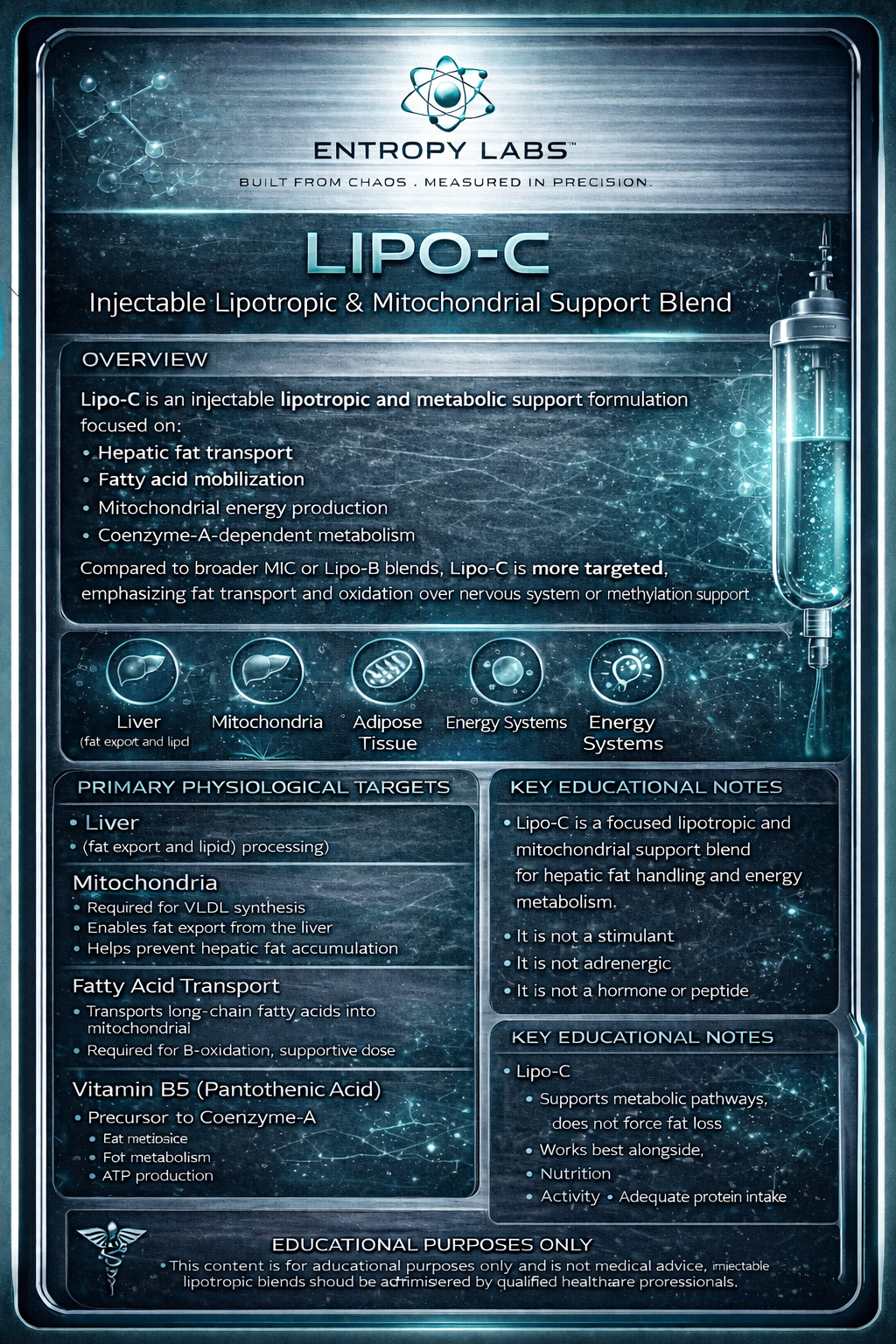 Lipo-C is a streamlined injectable lipotropic and metabolic support blend formulated to assist normal fat transport, liver lipid handling, and mitochondrial energy production. Unlike broader metabolic blends, Lipo-C is designed with a targeted approach, focusing specifically on the biochemical pathways involved in lipid mobilization and oxidation.