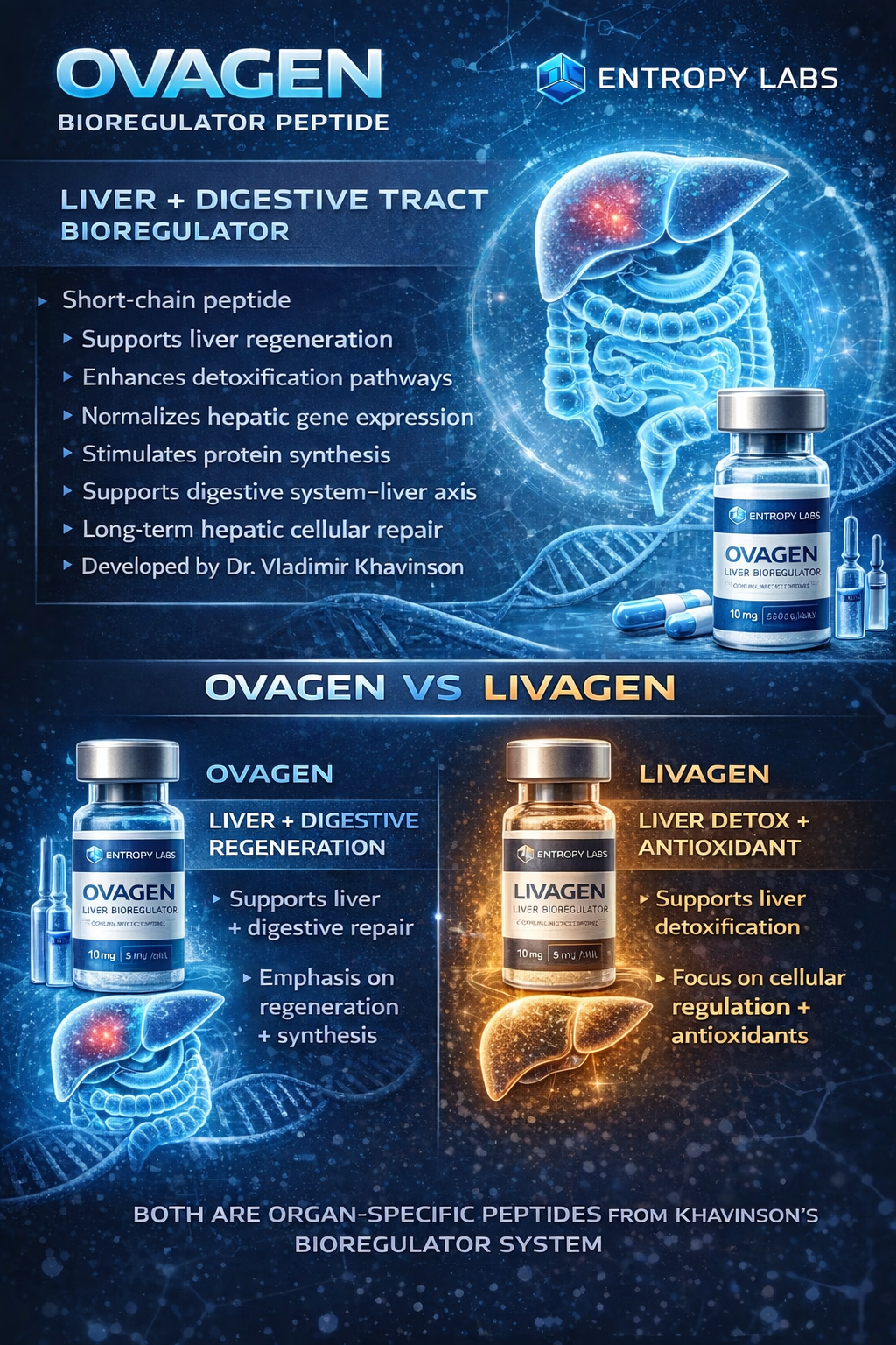 Ovagen is an investigational liver-targeted peptide that has been studied in Russian scientific literature for its potential influence on hepatocellular function, liver regeneration, and metabolic homeostasis. Structurally distinct from systemic hormones and growth factors, Ovagen appears to interact with liver-specific peptide receptors and signaling pathways, contributing to cellular protection mechanisms, antioxidative activity, and facilitation of liver tissue repair in models of hepatic stress.