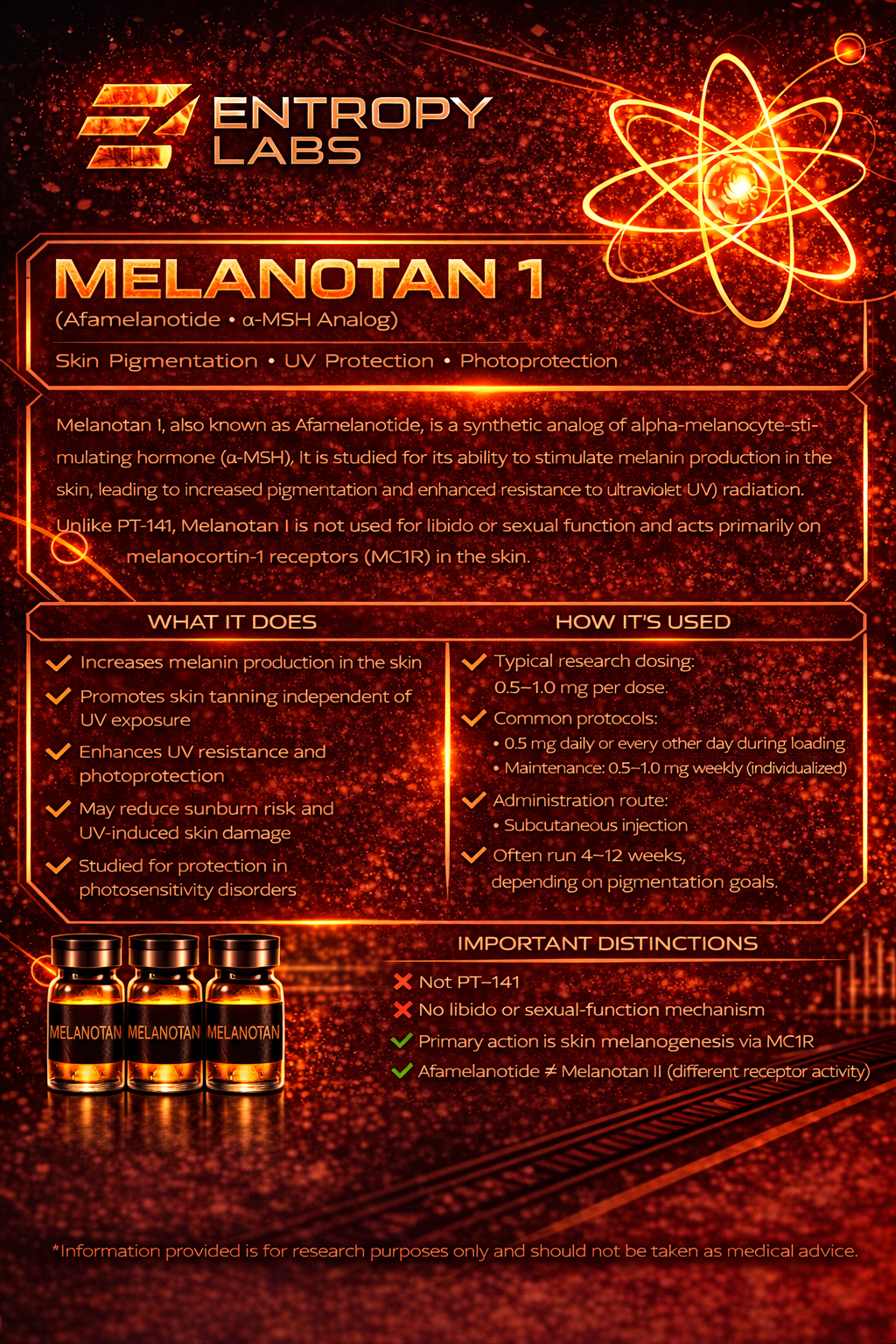 In research settings, Melanotan I has been explored for its interaction with melanocortin receptors related to pigmentation pathways and cellular signaling. Unlike compounds that act hormonally or metabolically, MT-I is primarily associated with pigmentation-related receptor activity and melanocyte stimulation.