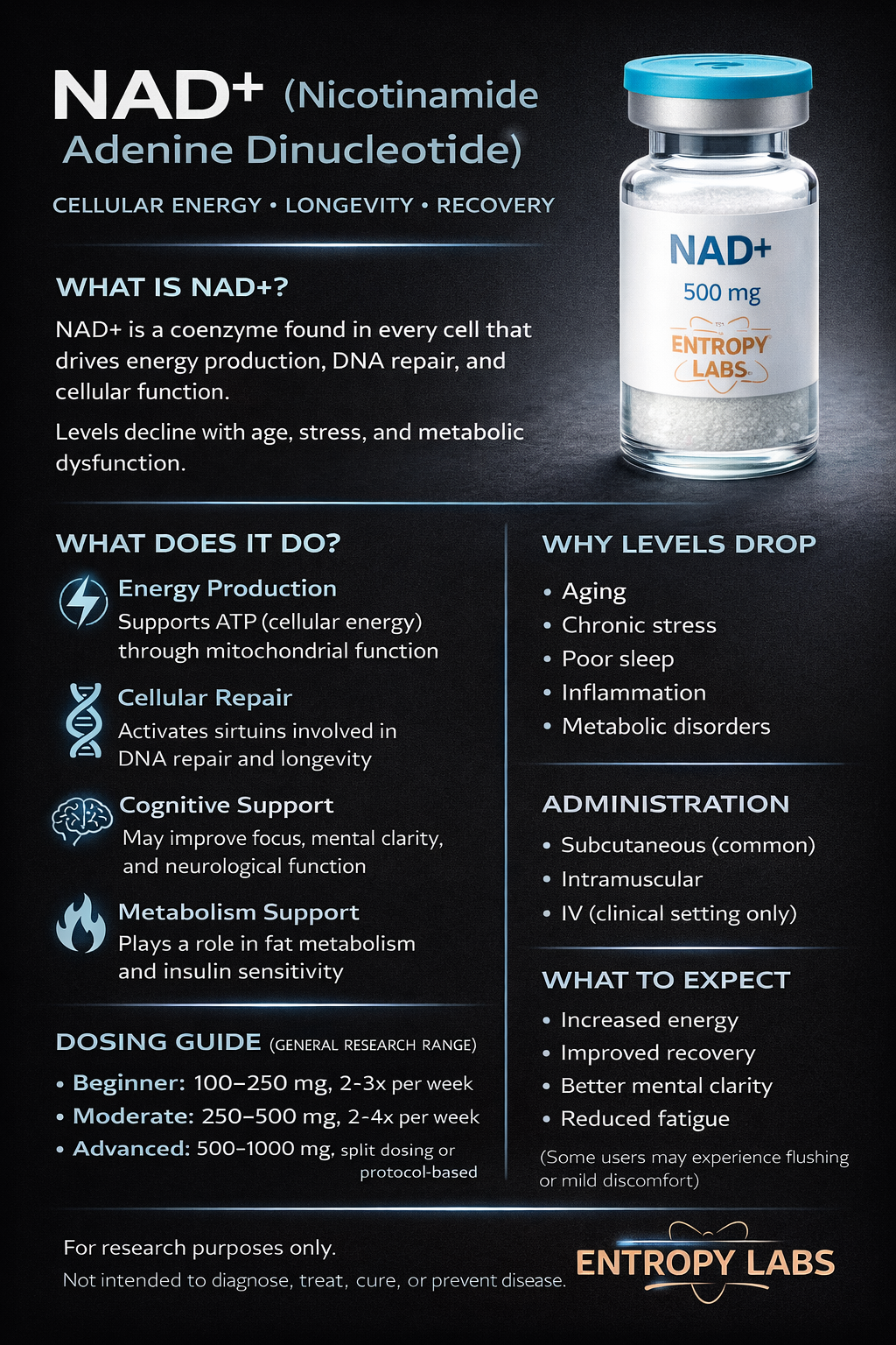 NAD+ (Nicotinamide Adenine Dinucleotide) is a vital coenzyme that plays a central role in cellular energy production, mitochondrial function, and DNA repair. It is essential for converting nutrients into usable energy (ATP) and supporting the activity of enzymes involved in longevity and cellular resilience.