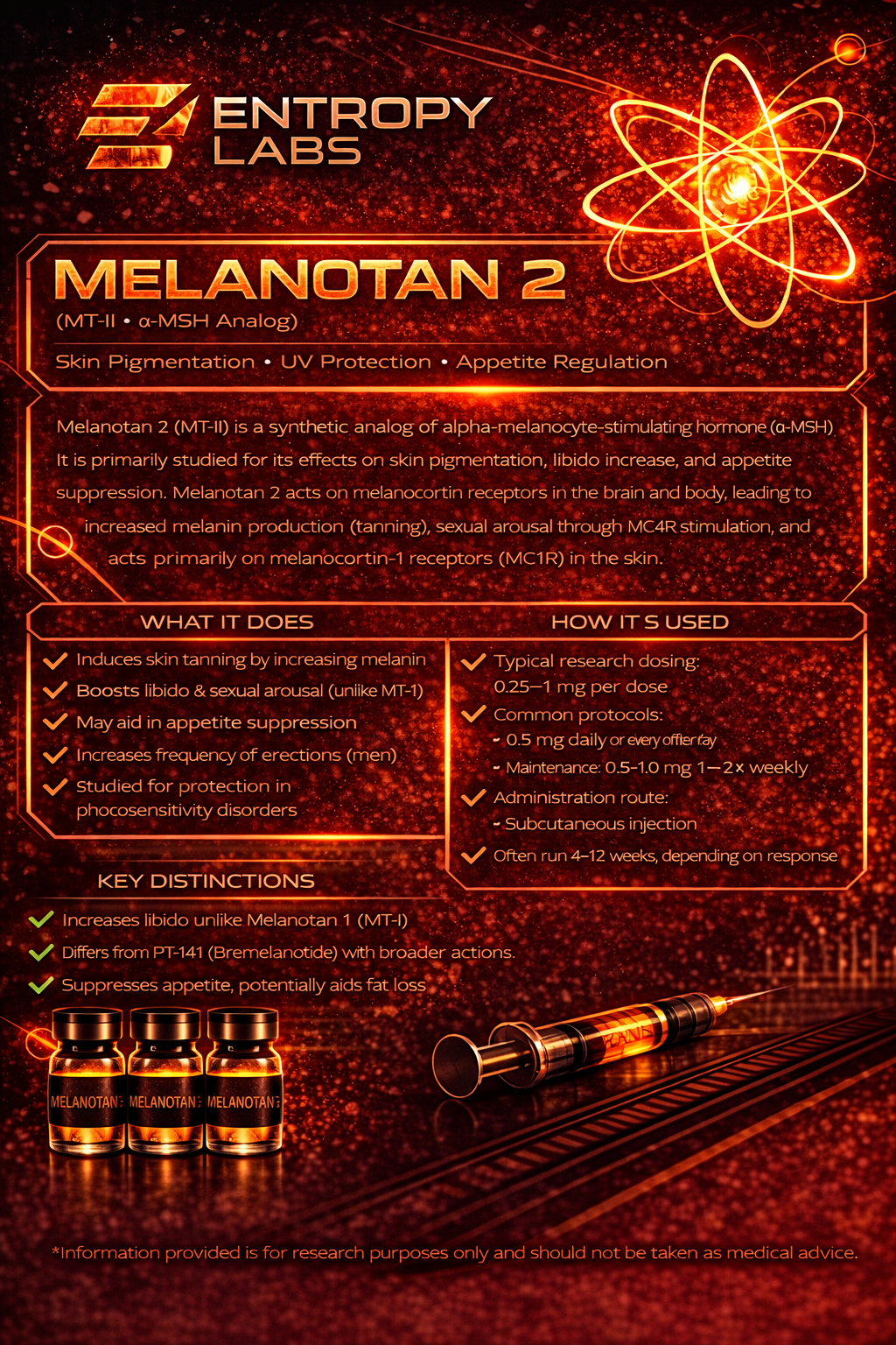 Melanotan II (MT-II) is a synthetic peptide studied for its activity within the melanocortin receptor system, a group of receptors involved in pigmentation, appetite signaling, and central nervous system pathways. MT-II is structurally related to alpha-melanocyte-stimulating hormone (α-MSH), a naturally occurring peptide that influences melanin production.